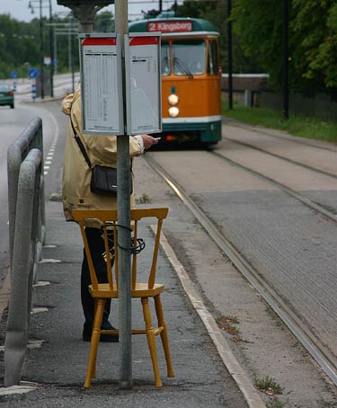 Någon är uppenbarligen trött på att stående invänta spårvagnen. Obs, cykellåset. Naturligtvis händer detta i Norrköping... de gula spårvagnarnas stad